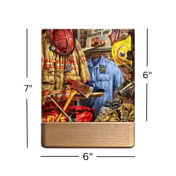 * Wood base with acrylic art panel * LED warm white illumination * USB powered, plug-in adapter included * Dimensions:7"x6"x2" * Artwork by Dona Gelsinger * For Indoor Use About the Art: Ignite the flames of love with our Firefighter LED Nightlight, a tribute to the brave souls who wear the full firefighter wardrobe. Enveloped in the essence of heroism, this nightlight captures the spirit of the firefighter's arsenal, from the protective jacket to the sturdy pants, mask, and helmets, down to the essential tools like the axe and pickaxe neatly stowed in a resilient bag. The warm, white LED illumination casts a gentle glow upon a meticulously crafted acrylic art panel, portraying the valor and dedication of firefighters. Designed by the renowned artist Dona Gelsinger, this nightlight stands proudly on a wood base, adding a touch of rustic charm to your space. Powered by USB for convenience, and with dimensions of 7"x6"x2", it's an intimate beacon of admiration for the courageous. Artist Links: Dona Gelsinger Products | Glow Decor www.donagelsinger.com Facebook.com/DonaGelsinger
