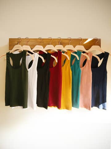 This top goes-with-anything racer-style tank features soft touch with a fitted silhouette.